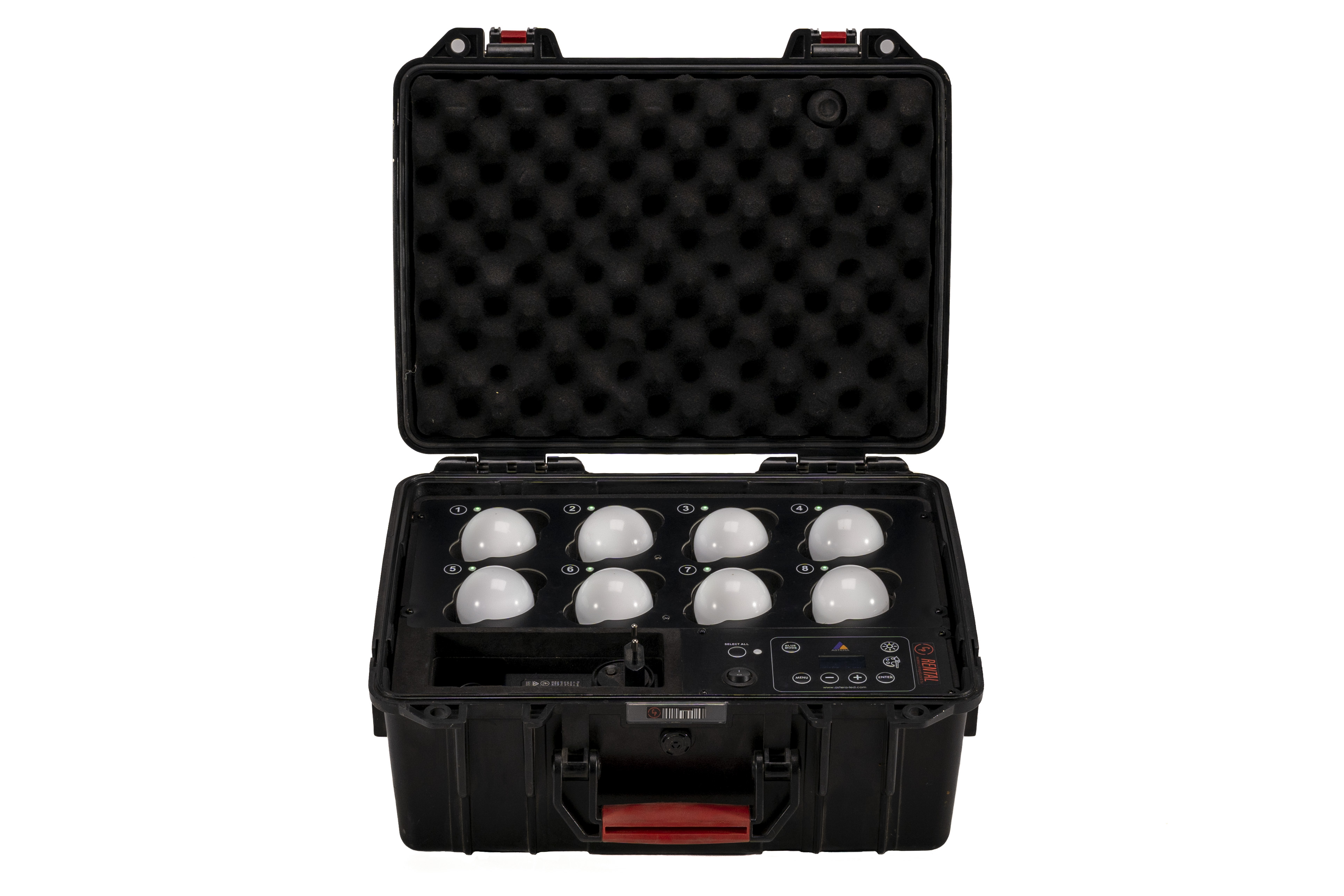 The LunaBulb LED Bulb with PrepCase Kit from Astera with eight LunaBulbs. Each LunaBulb is a compact, controllable LED light.